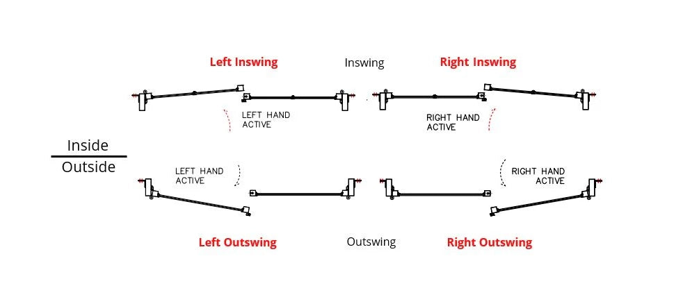 When facing the outside, a door that open from the interior of the house is an inswing. If the door opens from the exterior, it is an outswing. Second, if the hinges are on the left, the door is left handed. If the hinges are on the right, it is right handed